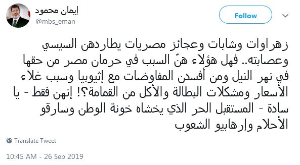 وقالت "محمود": "زهراوات وشابات وعجائز مصريات يطاردهن السيسي وعصابته.. فهل هؤلاء هنّ السبب في حرمان مصر من حقها في نهر النيل ومن أفسدن المفاوضات مع إثيوبيا وسبب غلاء الأسعار ومشكلات البطالة والأكل من القمامة؟!".