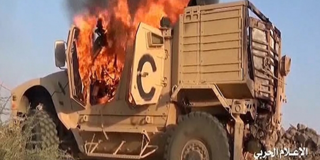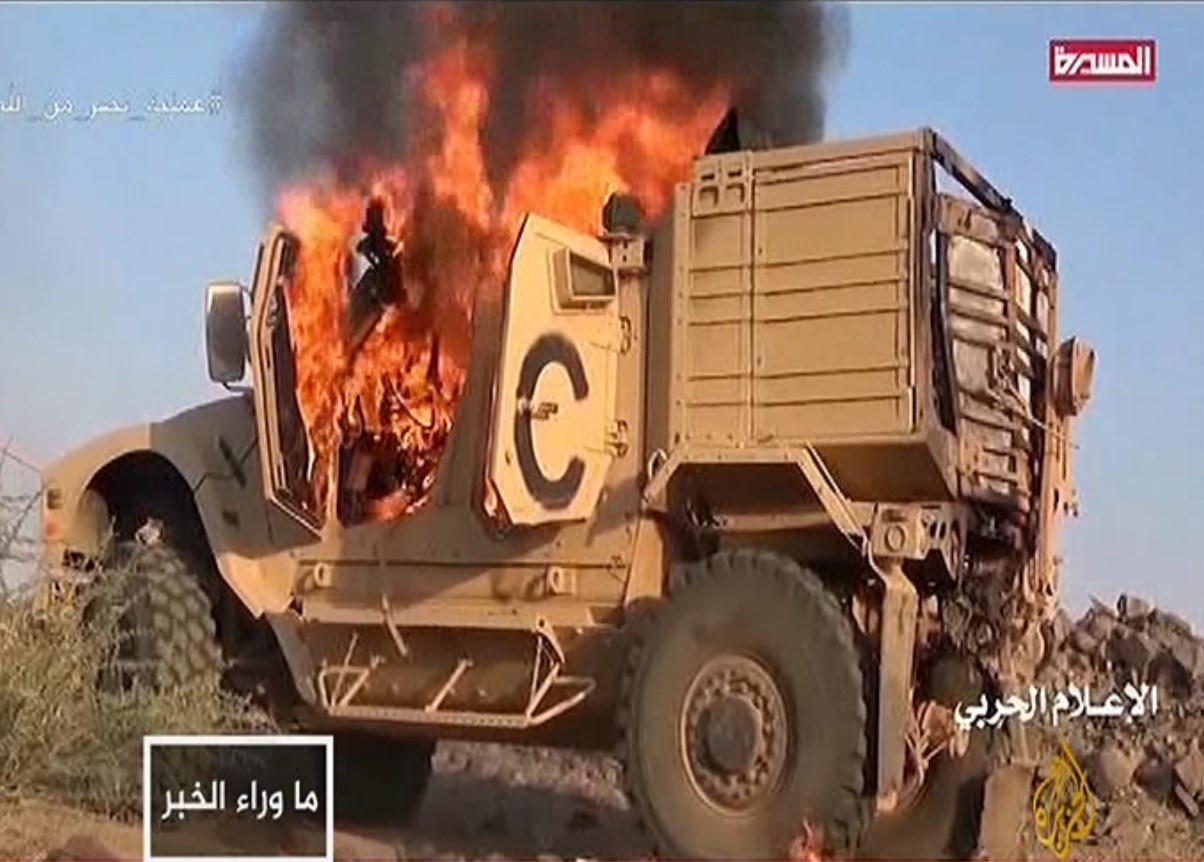 عن قرب شديد التُقطت هذه الصور لمدرعات سعودية أُعطبت في المعركة وخلفها الجنود، وهذه صور لوزير الدفاع التابع للحوثيين محمد ناصر العاطفي يقود مدرعة سعودية مما غنمه مقاتلوه.