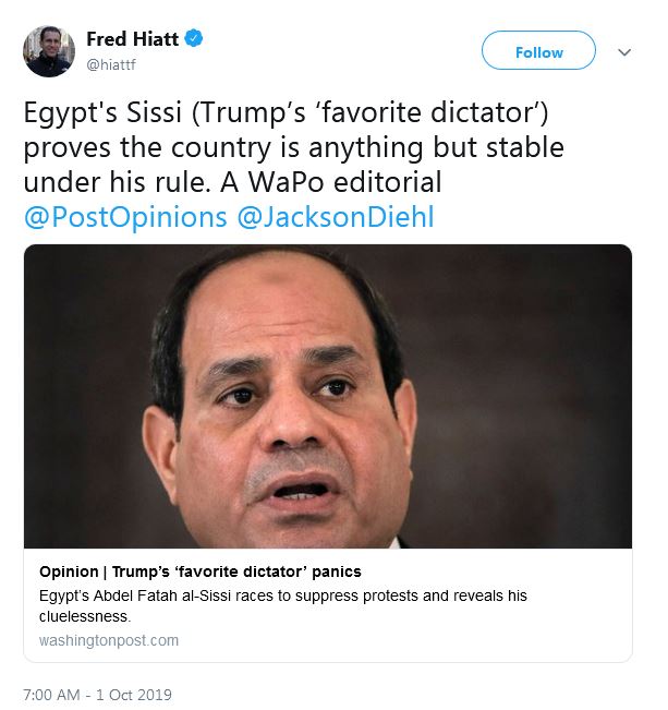 اعتبرت صحيفة “واشنطن بوست” الأمريكية أن السيسى الملقب بديكتاتور ترامب المفضل أصبح مرعوبا وقليل الحيلة تجاه تنامى غضب الشعب المصرى ضده أمام دعوات المقاول محمد علي الأخيرة اليوم الثلاثاء “#نازلين_الساعة_تلاتة”، فضلا عن تصدر هاشتاج “#انت_انتهيت_ياسيسي” التريند العالمي.
