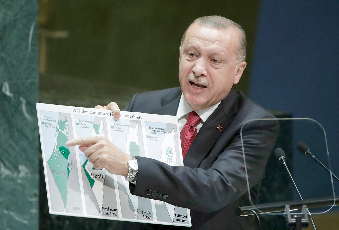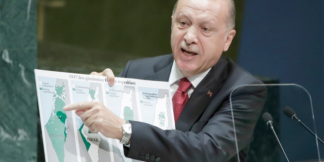 وفي 25 سبتمبر الماضي، وخلال إلقاء خطابه أمام الجمعية العامة للأمم المتحدة بخصوص القضية الفلسطينية، دافع أردوغان عن دولة فلسطين وانتقد تهويد القدس، وكان يحمل خارطة فلسطين خلال خطابه، موضحًا تلاشيها بسبب سياسة الاستيطان، ما أثار ضجة كبيرة، ولقي خطابه ترحيبًا فلسطينيًّا وعربيًّا، مقابل غضب صهيوني.