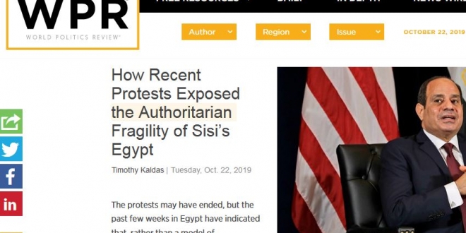 وعبثا يحاول السيسي أن يواجه الغضب بالقمع وقال إن شعبية السيسي الضعيفة تجعل من الصعوبة بل من المخاطرة بكسر العمود الفقري لنظامه. أن يعتقد أن خياره الوحيد هو مضاعفة القمع وزيادة عربات الموالين له.