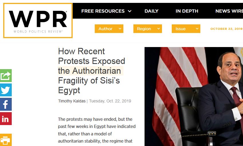 وعلى عكس ما يتوقع السيسي وأنصاره، قال إن تصرفات السيسي كسلطوي كفلت هشاشة النظام وقوضت دعمه الشعبي. موضحا أنه في محاولته الوقاية من الانقلابات انتقل إلى تفكيك مؤسسات الدولة الضعيفة بالفعل في مصر من خلال تعديل الدستور لتوسيع سيطرته الشخصية على السلطتين القضائية والتشريعية. لكن ذلك يجعل من الصعب صرف اللوم بمصداقية إلى المؤسسات الحاكمة الأخرى، مع جعل شعبية السيسي المتراجعة أكثر مسؤولية بل وتهديدا وجوديا للنظام.