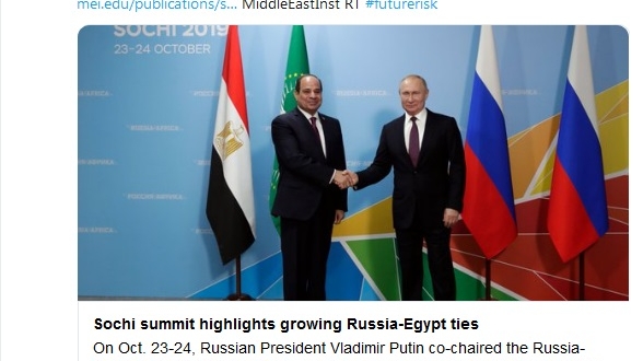 واهتم المعهد الامريكي بالمنتدى الاقتصادي الإفريقي الروسي في سوتشي، في الفترة من 23 إلى 24 أكتوبر، حيث ترأس الرئيس الروسي “فلاديمير بوتين” والسيسي القمة التي شهدت حضور 43 رئيس دولة إفريقية إلى المنتجع على البحر الأسود، شدد “السيسي” على أهمية تعزيز شراكة مصر مع روسيا، ووصف “بوتين” مصر بأنها “ركيزة للأمن والاستقرار في الشرق الأوسط وإفريقيا”.