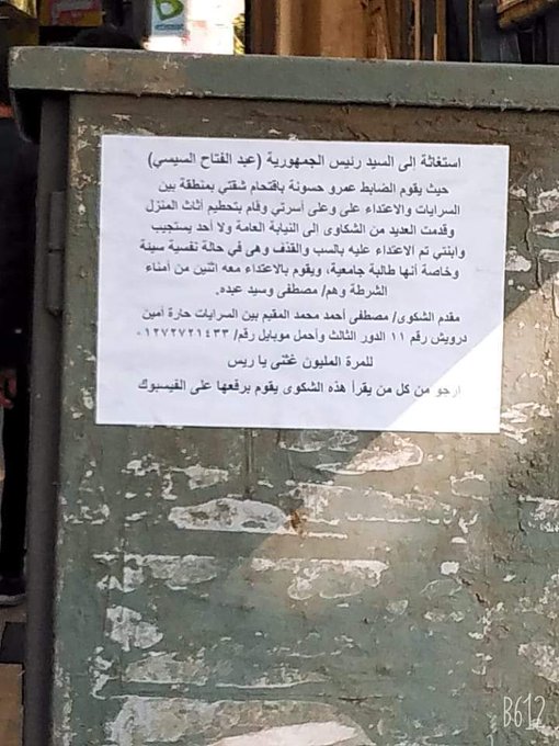 يقول الشاكي، ويدعى مصطفى أحمد محمد، في استغاثته التي توجّه بها إلى السفيه السيسي: “قام الضابط “عمرو حسونة” باقتحام شقتي بمنطقة بين السرايات والاعتداء علي وعلى أسرتي، وقام بتحطيم أثاث المنزل، وقدّمتُ العديد من الشكاوى إلى النيابة العامة ولا أحد يستجيب”.