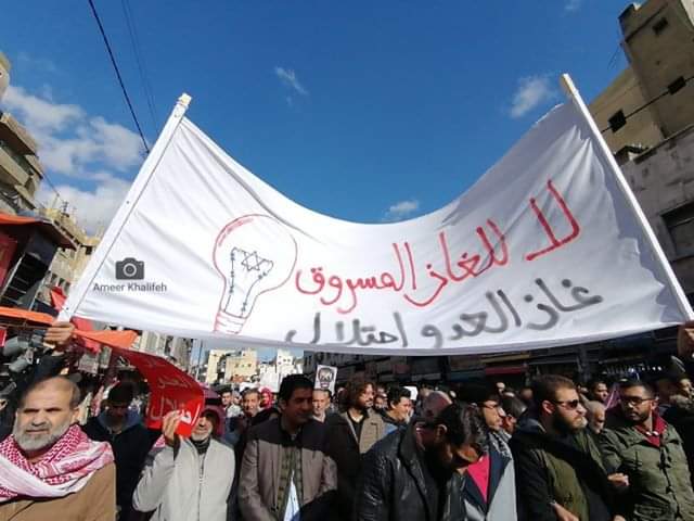وفي الأردن، شارك آلاف الأردنيين، في المسيرة الشعبية الحاشدة التي انطلقت من أمام المسجد الحسيني بالعاصمة عمان، رفضا لاتفاقية الغاز الموقعة مع سلطات الاحتلال الصهيوني، وطالب المشاركون بضرورة إقالة الحكومة ومحاسبة المسئولين والموقعين على الاتفاقية.