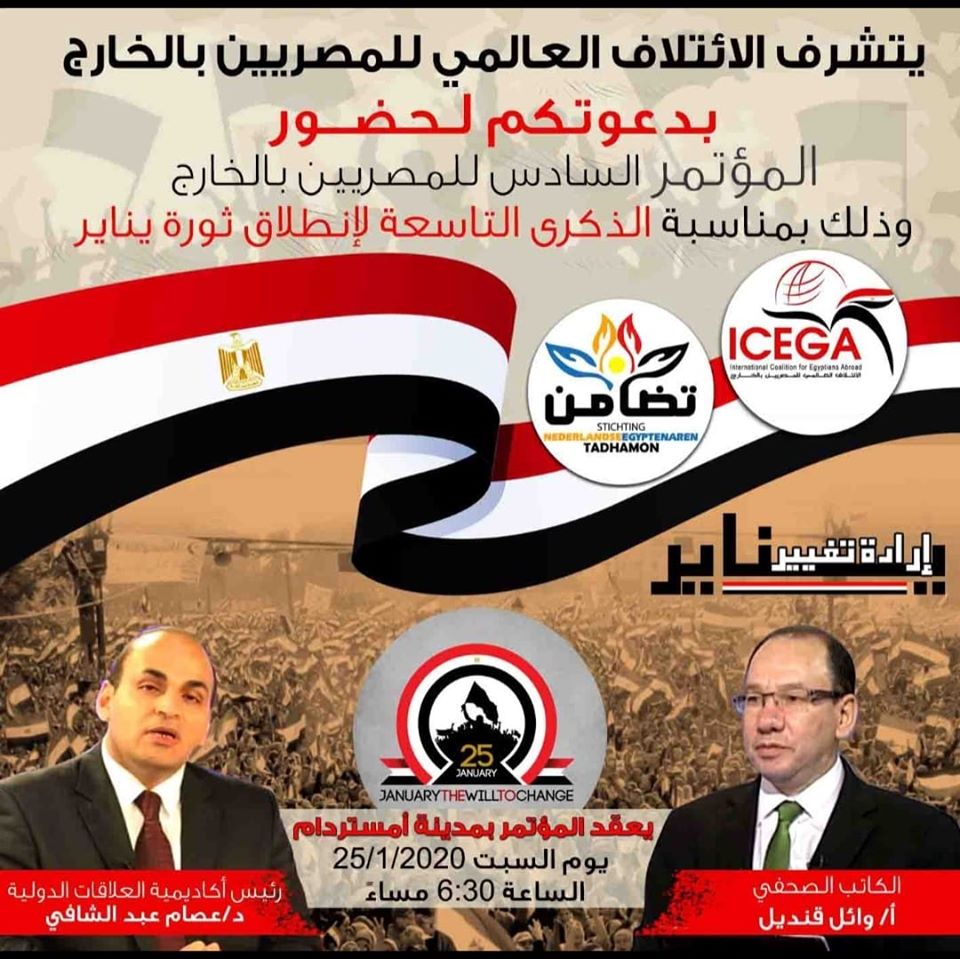ودعا الائتلاف إلى المشاركة في المؤتمر الذي يحضره الكاتب الصحفي وائل قنديل، والدكتور عصام عبد الشافى رئيس أكاديمية العلاقات الدولية، حيث يُعقد المؤتمر بمدينة أمستردام وينطلق في تمام السادسة والنصف مساء.