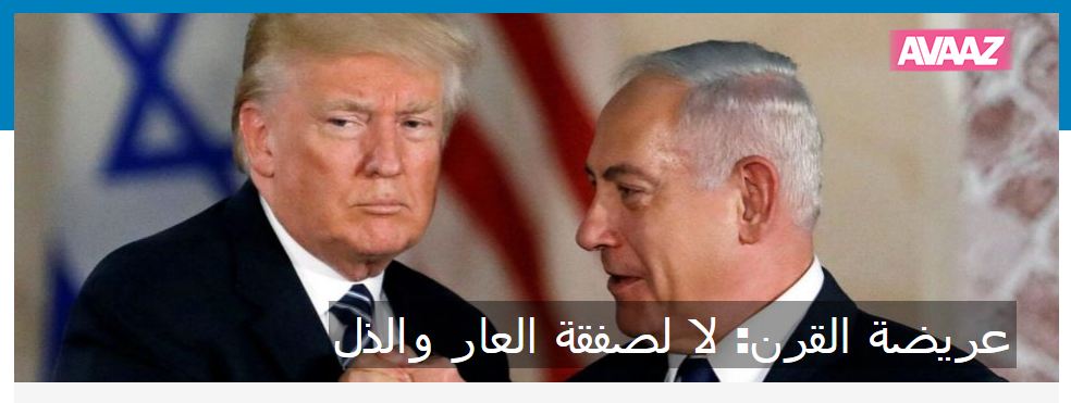 وألمحوا إلى أنه “قد يتمكن بلطجي البيت الأبيض من تهديد حكوماتنا لمنعها من صد هذه المؤامرة لكننا كشعوب لن نصمت ولن نسمح لهذه الصفقة بأن تمر.. وقّعوا على “عريضة القرن” وانشروها على أوسع نطاق! ستعمل “آفاز” على نشرها في كبريات الوسائل الإعلامية في واشنطن والعالم، لنغلق الباب أمام تنمر ترامب وكذبه وبلطجيته، ونرمي صفقته في مزبلة التاريخ”.