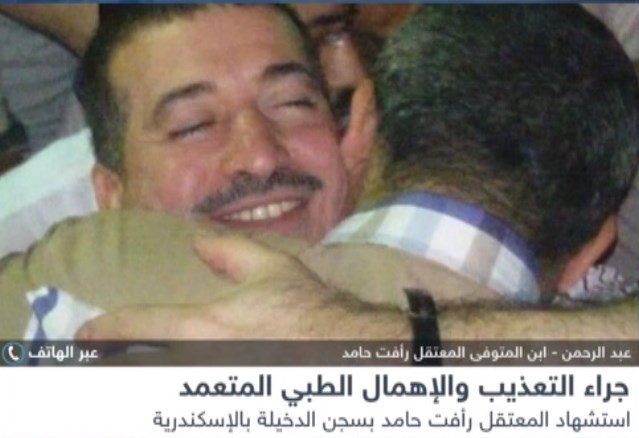 استشهد المعتقل رأفت حامد (58 سنة) من منطقة المندرة بالإسكندرية داخل قسم شرطة الدخيلة جراء التعذيب والإهمال الطبي المتعمد. وكشفت مصادر حقوقية عن أن حامد اعتقل من داخل منزله وأخفي قسريا لمدة 9 أيام داخل مقرات الأمن الوطني موضحة تعرضه لتعذيب وحشي أدى إلى إصابته بشلل نصفي، وأضافت المصادر أن مأمور قسم الدخيلة رفض عرضه على طبيب مختص.