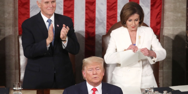 WASHINGTON, DC - FEBRUARY 04: House Speaker Rep. Nancy Pelosi (D-CA) rips up pages of the State of the Union speech after U.S. President Donald Trump finishes his State of the Union address in the chamber of the U.S. House of Representatives on February 04, 2020 in Washington, DC. President Trump delivers his third State of the Union to the nation the night before the U.S. Senate is set to vote in his impeachment trial. (Photo by Mark Wilson/Getty Images)