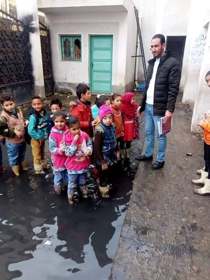 وأظهرت الصورة تنظيم طلاب المعهد الأزهري الابتدائي بقرية المندورة في كفر الشيخ، وسط مياه الصرف الصحي.