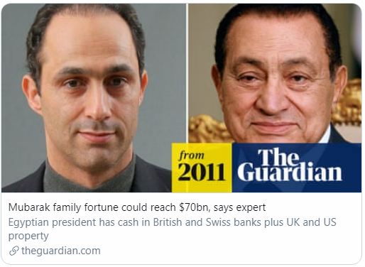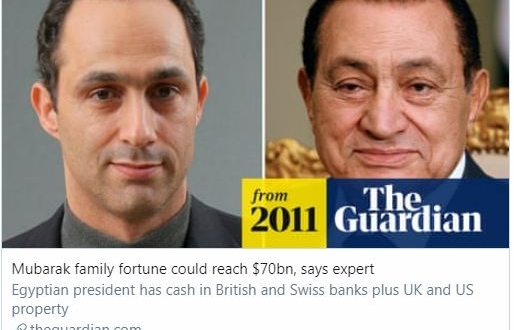 استعاد نشطاء على مواقع التواصل، في إطار السخرية من حضور المنقلب السيسي جنازة المخلوع وحديثه مع أولاد مبارك علاء وجمال، عن نصيبه من تركة المخلوع التي تعدّى جمعه لها نحو ثلاثين عامًا قضاها في الرئاسة، واستعادوا مقالًا عمره أكثر من 9 سنوات بأرشيف صحيفة الجارديان البريطانية.