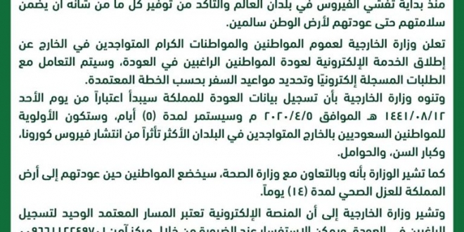 ونوهت “الخارجية السعودية” إلى أن تسجيل بيانات العودة للمملكة سيبدأ اعتبارا من يوم الأحد 12/08/1441هـ الموافق 5/4/2020م، وسيستمر لمدة (5) أيام، وستكون الأولوية للمواطنين السعوديين بالخارج المتواجدين في البلدان الأكثر تأثراً من انتشار فيروس #كورونا، وكبار السن، والحوامل.