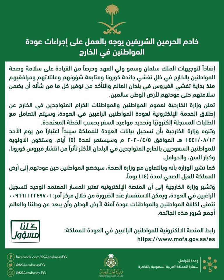 أعلنت السفارة السعودية بالقاهرة، في بيان لها نشرته قبل قليل من مساء الأحد، عن أن وزارة الخارجية السعودية تدعو عموم المواطنين والمواطنات الكرام المتواجدين في الخارج إلى إطلاق الخدمة الإلكترونية لعودة المواطنين الراغبين في العودة، وسيتم التعامل مع الطلبات المسجلة إلكترونيًا وتحديد مواعيد السفر بحسب الخطة المعتمدة.