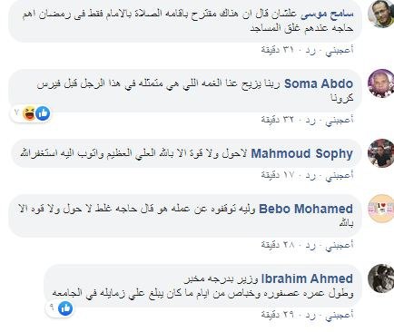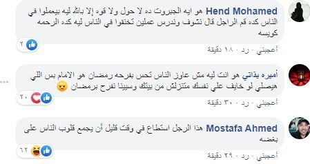 وكتبت أميرة: “هو انت ليه مش عاوز الناس تحس بفرحة رمضان؟ هو الإمام بس اللي هيصلي؟ لو خايف على نفسك متنزلش من بيتك وسيينا نفرح برمضان”. فيما كتب مصطفى أحمد: “هذا الرجل استطاع في وقت قليل أن يجمع قلوب الناس على بغضه”.