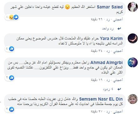 وكتب سامح موسى: “علشان قال إن هناك مقترحا بإقامة الصلاة بالإمام فقط فى رمضان أهم حاجة عندهم غلق المساجد”. فيما كتبت سوما عبده: “ربنا يزيح عنا الغمة اللي هي متمثلة في هذا الرجل قبل فيروس كورونا”.