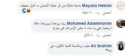 وكتبت نهى أحمد: “فعلا اتعلمنا نغسل إيدينا من الڤيديو وفنفس الوقت اتعلمنا نسيب الماية مفتوحة بالشدة دي”، فيما كتبت هدى أحمد: “خلصتي الميه ياحجه نهر النيل”، وكتبت ميادة حبيش: “حاجة هايلة بس لو عملنا التحدى ده النيل هيجف”، وكتبت محمد عبد المنعم: “ربنا يرحمنا ويريحنا منك.. ارحمينا بقي يا ست دا حتى الإسراف فى حرام”، وكتب علي إبراهيم “طيب وبالنسبة للميه الكتيره دي..ايه؟؟”