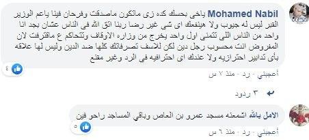 وكتب محمد نبيل: “يا أخى بحسك كده زى ماتكون ما صدقت وفرحان فينا.. يا عم الوزير القبر ليس له جيوب، ولا هينفعك أى شيء غير رضا ربنا.. اتق الله فى الناس عشان بجد أنا واحد من الناس اللى تتمنى أول واحد يخرج من وزارة الأوقاف وتتحاكم على ما اقترفت؛ لأن المفروض إنت محسوب رجل دين لكن للأسف تصرفاتك كلها ضد الدين وليس لها علاقه بأي تدابير احترازية، ولا عندك أى احترافية فى الرد وغير مقنع”.