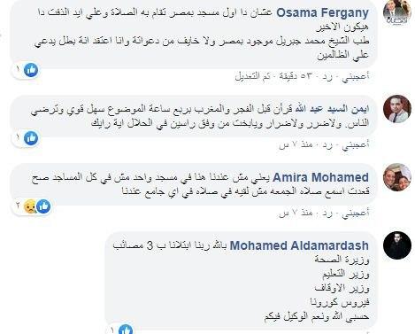 فيما كتب أيمن السيد عبد الله: “قرآن قبل الفجر والمغرب بربع ساعة الموضوع سهل قوي”، وكتبت أميرة محمد: “يعني مش عندنا هنا في مسجد واحد مش في كل المساجد صح، قعدت أسمع صلاه الجمعة مش لاقية فيه صلاة في أي جامع عندنا”.