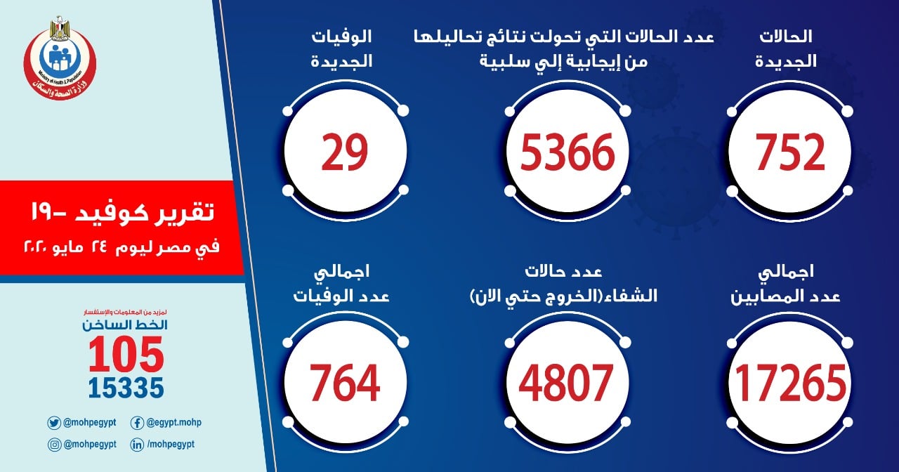 وذكر "مجاهد" أن إجمالي العدد الذي تم تسجيله في مصر بفيروس كورونا المستجد حتى اليوم، الأحد، هو 17265 حالة من ضمنهم 4807 حالات تم شفاؤها وخرجت من مستشفيات العزل والحجر الصحي، و 764 حالة وفاة.