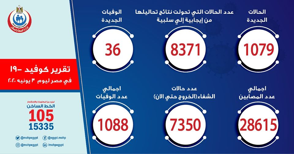أعلنت وزارة الصحة في حكومة الانقلاب عن ارتفاع عدد المصابين بفيروس كورونا المستجد، حتى اليوم الأربعاء، إلى 28615 حالة بعد تسجيل 1079 إصابة جديدة، وارتفاع عدد الوفيات إلى 1088 حالة وفاة بعد تسجيل 36 حالة وفاة.
