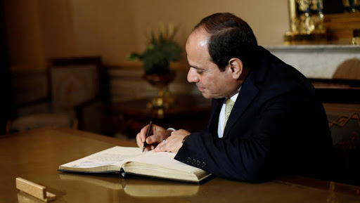 Egyptian President Abdel Fattah al-Sisi signs the guest book prior to a meeting with French Minister of the Armed Forces, Florence Parly (not pictured), at the Defense Ministry in Paris, France, October 23, 2017. REUTERS/Thibault Camus/Pool