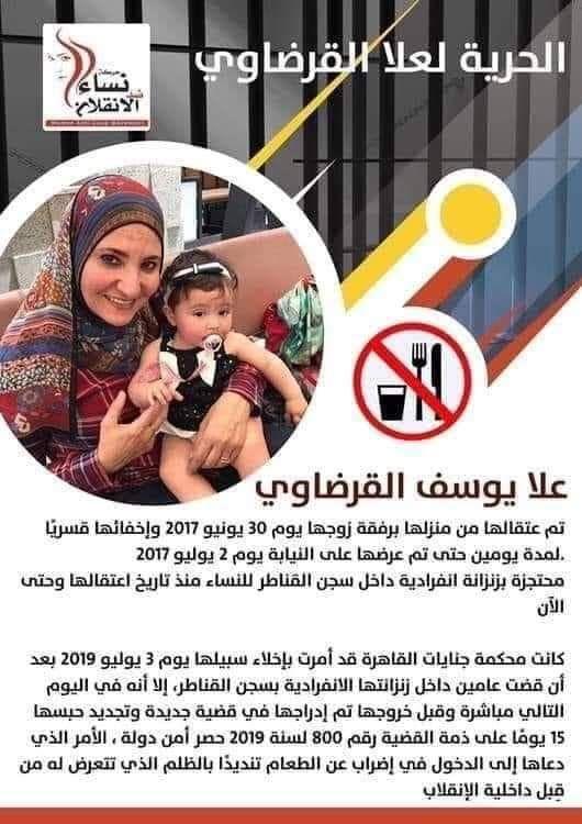 وتابعت “أكثر من سنتين في زنزانة انفرادية، ممنوع عنها الدواء والطعام، يُخيم الحزن والكسرة وجهها، تعامل أسوأ معاملة لأنها فقط تحمل اسم القرضاوي!”. واختتمت بالمطالبة بالحرية لعلا القروضاوي!