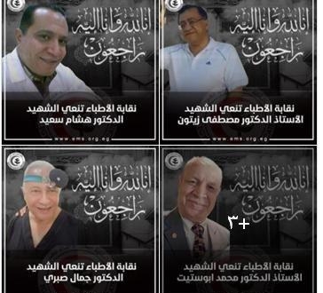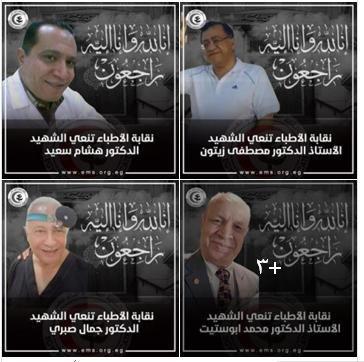 نعت النقابة العامة للأطباء استشهاد 6 أطباء، اليوم الأحد، توفوا إثر إصابتهم بفيروس كورونا المستجد، وهم: الدكتور عمر عبد الرافع استشاري الباطنة ورئيس أقسام الباطنة بمستشفى أم المصريين سابقا، الدكتور هشام سعيد استشاري الأنف والأذن والحنجرة بمستشفى أم المصريين، الدكتور مصطفى زيتون أستاذ النساء والتوليد بطب الزقازيق، الدكتور جمال صبري استشاري الأنف والأذن والحنجرة بمستشفى التل الكبير بالإسماعيلية، الدكتور محمد أبو ستيت أستاذ الجراحة بطب الأزهر، الدكتور عماد حبيب استشاري الباطنة بمستشفى مغاغة بالمنيا.