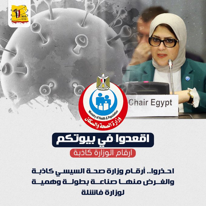 تصدر هاشتاج "اقعدوا في بيوتكم" على موقع التواصل الاجتماعي "تويتر"، وكان السبب الأول براي النقاد على التواصل أن أرقام وزارة صحة السيسي كانت كاذبة، والغرض منها صناعة بطولة وهمية لوزارة فاشلة، وأن السيسي وعصابته "مش فاضيين لهموم المصريين ولا الاهتمام بأرواحهم".