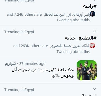 منذ الساعات الأولى من صباح الجمعة وحتى الآن يتصدر هاشتاج #رابعة قمة التداول في مصر، وأضيف له عصرا بقوة هاشتاج #رابعة_جريمة_ضد_الانسانية ووسوم أخرى، منها #لن_ننسى_رابعة و#رابعة_الصمود وغيرها؛ تضامنا مع حق شهداء قتلوا بدم بارد خائن مضى عليه 7 سنوات، يأكل الانقلابيون ويتمتعون كما البهائم، غير مهتمين بما سال بل ويمعنون الأذى بأهل رابعة ومن ناصرهم.