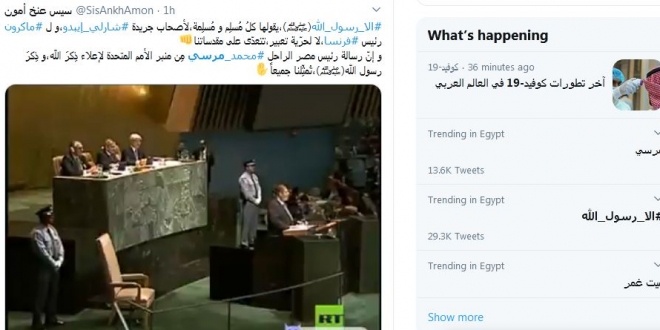 تصدر اليوم الخميس في مصر ثلاثة هاشتاجات تكاد مرتبطة ببعضها البعض، الأول #إلا_رسول_الله و"مرسي" وولليوم السادس على التوالي، هاشتاج #مش_عاوزينك_ياسيسي وزاد النشطاء على أسباب رفضهم المنقلب فوق أنه صرح باستعداده للتخلي عن السلطة حال رفض الشعب وجوده، الإساءة التي تعمد صديقه ماكرون توجيهها للرسول صلى الله عليه وسلم من خلال إعادة صحيفة "شارلي إيبدو" الرسوم المسيئة للنبي محمد صلى الله عليه وسلم.
