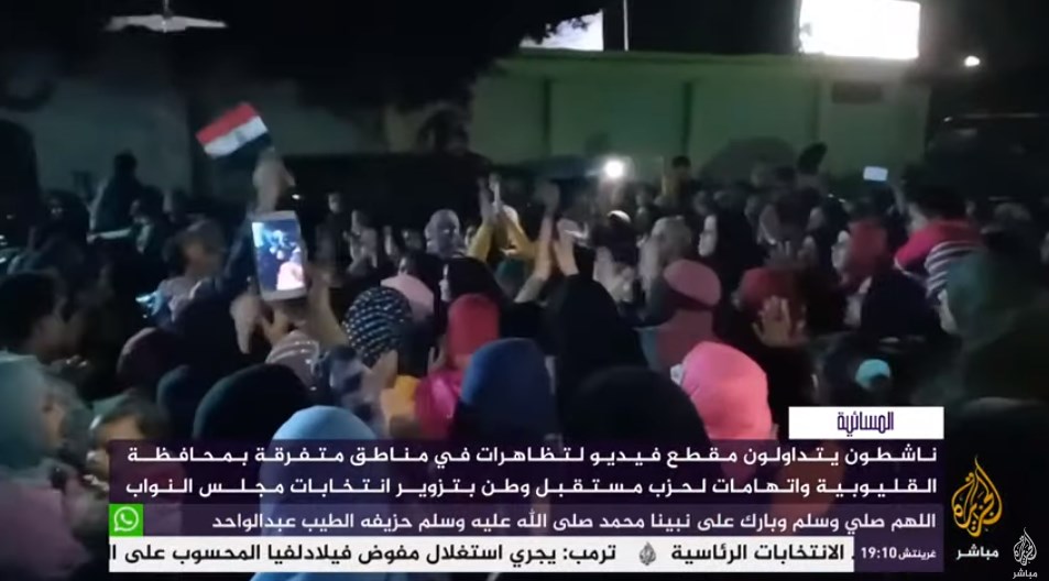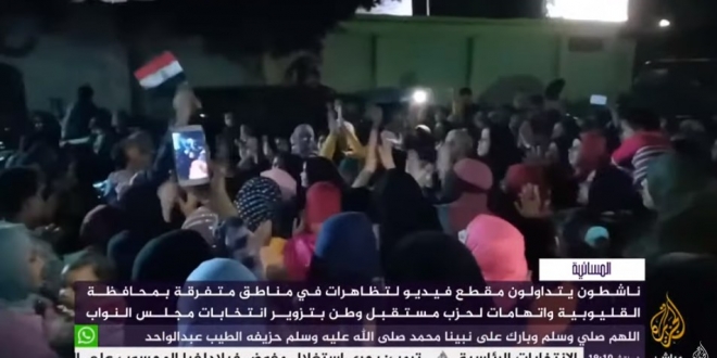 تداول ناشطون على مواقع التواصل الاجتماعي مقاطع فيديو تُظهر مظاهرات بدائرة قها طوخ في محافظة القليوبية وسط اتهامات لحزب مستقبل وطن بتزوير انتخابات برلمان العسكر.