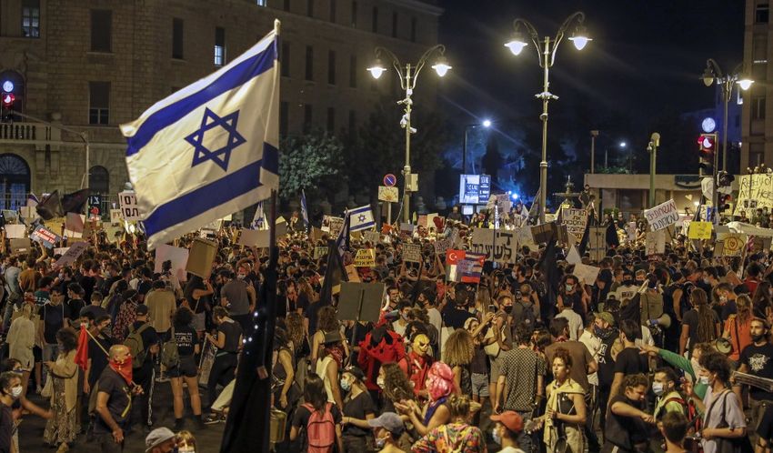 Protesters gather for a demonstration against the Israeli government near the Prime Minister's residence in Jerusalem on July 25, 2020. (Photo by AHMAD GHARABLI / AFP)