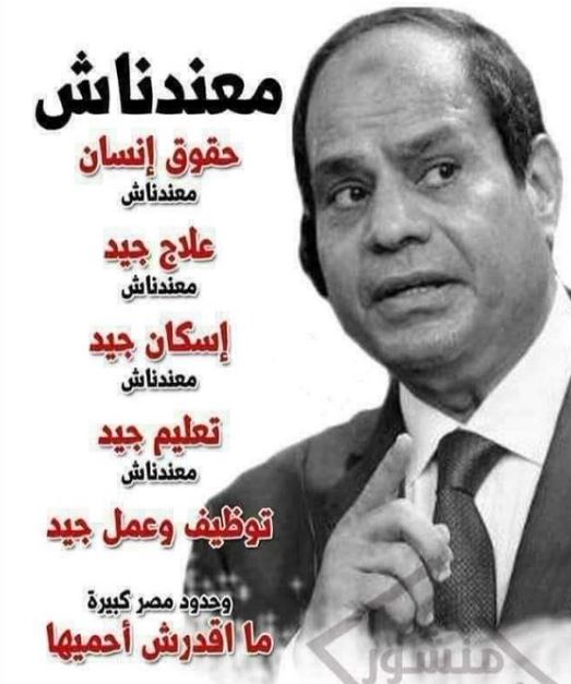 أما فلور @l3ONk6MFkMDTwBP فوصفت المشهد أنه "رشح في التعليم.. زكام في الصحة.. تكسير في الاقتصاد.. ورم في الأمن.. صداع في السياحة.. وجع في المجتمع.. إسهال في الثقافة.. إمساك في الأخلاق.. تضخم في الهيافة.. أنيميا في الأرض.. زرقان في الإعلام.. احتقان في الدين.. عسر هضم في الفهم.. حول في الجيش.. كل دي أعراض لمرض واحد اسمه (الاستبداد) ".