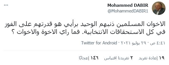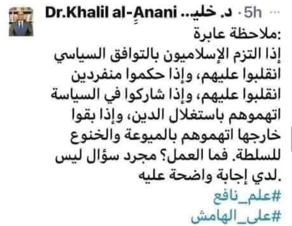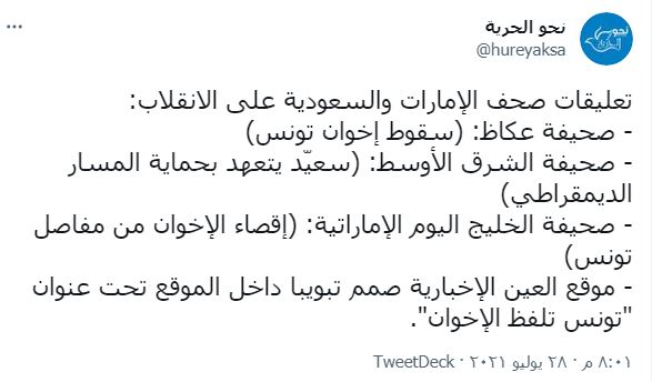 وأوضح تغريدته بأخرى موضحا المقصد في تونس "هللوالانقلاب تونس وشمتوا في الإخوان وانتقدوهم واتهموهم بالغباء وطالبوهم بالانسحاب من العمليةالسياسية، وتجاهلوا تضحياتهم وتأثيرهم الدعوي والثقافي والنقابي والسياسي والخدمي والاجتماعي وغيره من المجالات.. تجاهلوا ١٢معتقلا إخوانيا بانتظارتنفيذ حكم الإعدام، و٦٠ألف معتقل.. ".