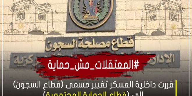 تصدر هاشتاج #المعتقلات_مش_حماية بعدما قررت داخلية الانقلاب تغيير مسمى (قطاع السجون) إلى (قطاع الحماية المجتمعية)، في محاولة منها لإخفاء الجرائم التي ترتكبها بحق كل المسجونين لاسيما أصحاب المحبوسين على ذمة آرائهم ومعارضتهم، فبات تغيير المسمى يشابه تغيير مسمى "الخمور" إلى "مشروبات روحية" بحسب الناشطين.