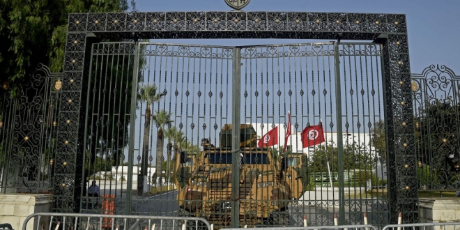TOPSHOT - Tunisian army barricade the parliament building in the capital Tunis on July 26, 2021, after the president dismissed the prime minister and ordered parliament closed for 30 days. - Tunisian President Kais Saied sacked the defence minister, a day after ousting the prime minister and suspending parliament, plunging the young democracy into constitutional crisis in the midst of a pandemic. (Photo by Yassine MAHJOUB / AFP) (Photo by YASSINE MAHJOUB/AFP via Getty Images)