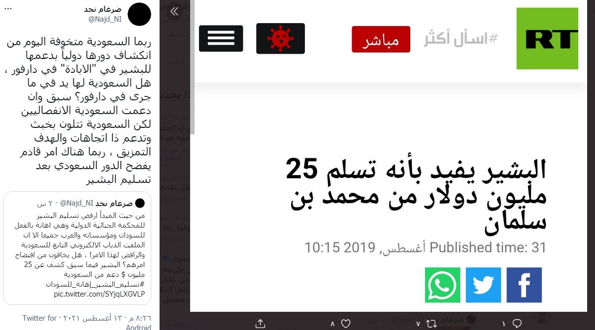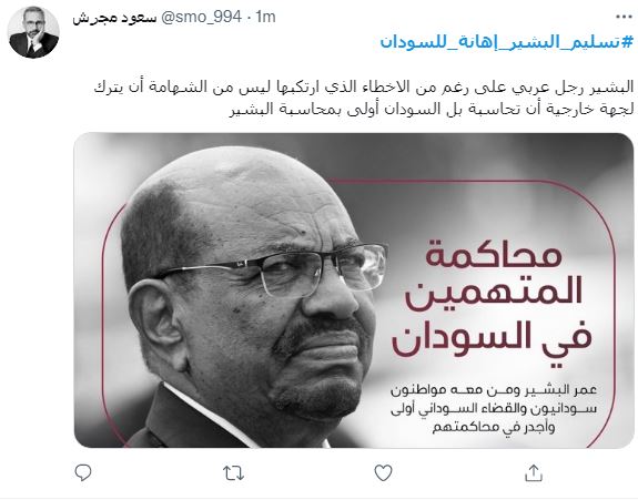 وتصدر خلال اليومين الماضيين هاشتاج #تسليم_البشير_إهانة_للسودان التريند في السودان ولكن كان مثيرا للعجب أن يتصدر في السعودية وأن تتوحد رسالة الذباب الإلكتروني السعودي دعما لعدم محاكمة الرئيس عمر البشير ومجموعة من مساعديه أمام المحكمة الجنائية الدولية وذلك استهجانا لقرار الحكومة الانتقالية بتسليم الرئيس البشير للمحكمة الدولية.