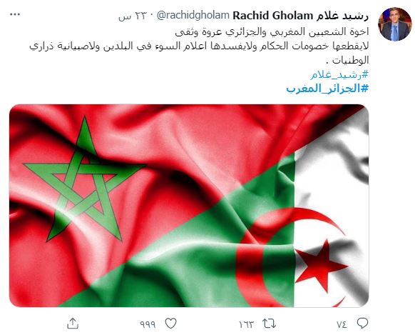 وعلق الكاتب الجزائري محمد العربي زيتوت متهما بن زايد بتفتيت اللحمة بين البلدين وقال عبر @mohamedzitout: "دور إماراتي شديد القذارة.. في تصاعد الخلافات بين النظامين في الجزائر وفي الرباط.. ثم في قطع العلاقات الدبلوماسية بين البلدين".