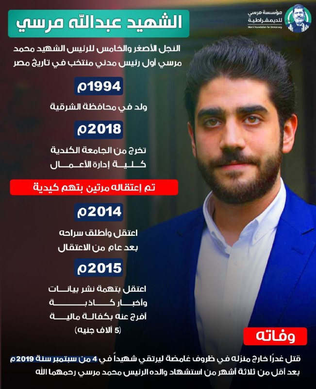 أحيت "مؤسسة مرسي للديمقراطية" ونشطاء، اليوم، الذكرى الثانية لاستشهاد "عبد الله" نجل الرئيس الشهيد محمد مرسي، وقالت المؤسسة في بيان إن "عبدالله مرسي رفض الظلم الذي وقع على وطنه وأسرته وتحرك دون تردد لحمل راية أبيه رحمه الله محبا لوطنه وللحرية والعدالة، حتى توفاه الله في ظروف غامضة وملابسات مريبة ".