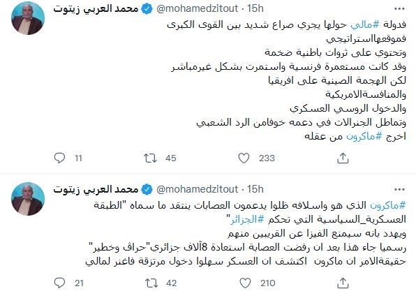 وأضاف محمد العربي زيتوت @mohamedzitout يلوم على النظام الجزائري معتبرا أن ردهم أقل من المتوقع "في رد وضيع على السفيه ماكرون لم يجد نظام الحكم غير الشرعي أكثر من استدعاء السفير وغلق أجواء الجزائر أمام الطائرات العسكرية الفرنسية".