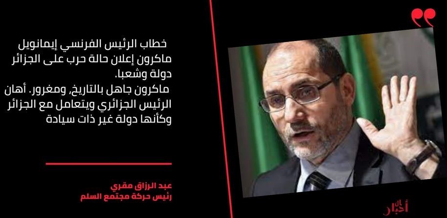 بدوره علق عبد الرزاق مقري، رئيس "حركة مجتمع السلم (حمس) قائلا إن "خطاب ماكرون هو إعلان حالة حرب على الجزائر دولة وشعبا، مضيفا أن الرئيس الفرنسي جاهل بالتاريخ ومغرور يهين الرئيس الجزائري".