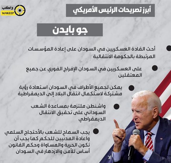 وأضاف أنه ينبغي "المساعدة على اتخاذ خطوات من أجل بلد ديمقراطي". وأيد بايدن "الوقوف إلى جانب شعب السودان ونضاله السلمي لدفع أهداف ثورة السودان".