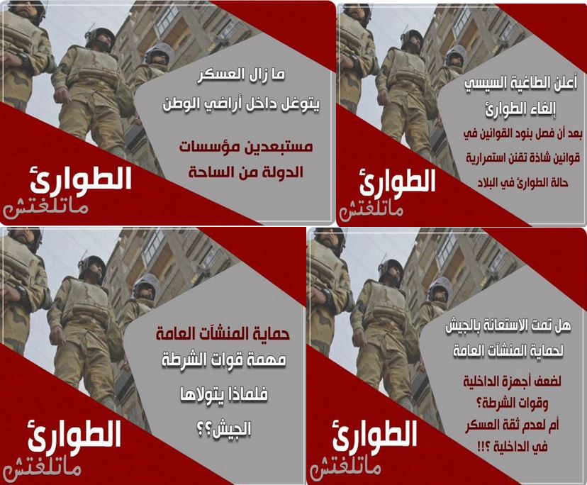 تفاعل ناشطون على موقع "تويتر" مع هاشتاج #الطوارئ_ماتلغتش معتبرين أن إلغاء قانون الطوارئ ليس حقيقيا وأن قوانين أخرى تسفر عن قمع أشد بأسا من الطوارئ أو توازيه في الانتهاكات بشأن حقوق الإنسان.