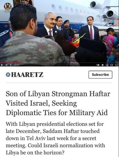 وقالت الصحيفة: "يسعى الأب والابن إلى الحصول على مساعدة عسكرية ودبلوماسية من إسرائيل ، وبالمقابل وعد أنهما إذا ترأسا حكومة الوحدة الوطنية والمصالحة التي سيتم تشكيلها في ليبيا بعد الانتخابات الرئاسية في 24 كانون الأول (ديسمبر) ، فسيبدآن علاقات دبلوماسية مع القدس".