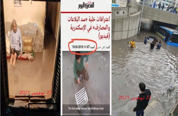 رغم أنها مصيبة لا يتمنى المصريون استمرارها، إلا أن الأمطار التي هطلت على محافظة الإسكندرية، صباح الاثنين 22 نوفمبر، ساهمت وتراكمات الأمطار التي لم يتم معالجة آثارها، في الكشف عن فساد متجذر، صنعه الانقلاب عندما ترك معالجة الأسباب التي تغرق الإسكندرية بشكل موسمي واتهم جماعة الإخوان بسد البالوعات!