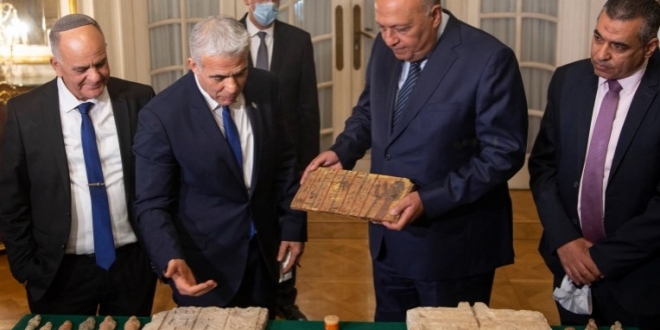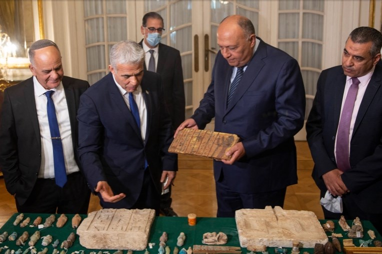 وخلال محادثات منفصلة مع نظيره المصري سلم لبيد 95 قطعة أثرية مصرية مسروقة كانت قد استولت عليها إسرائيل.