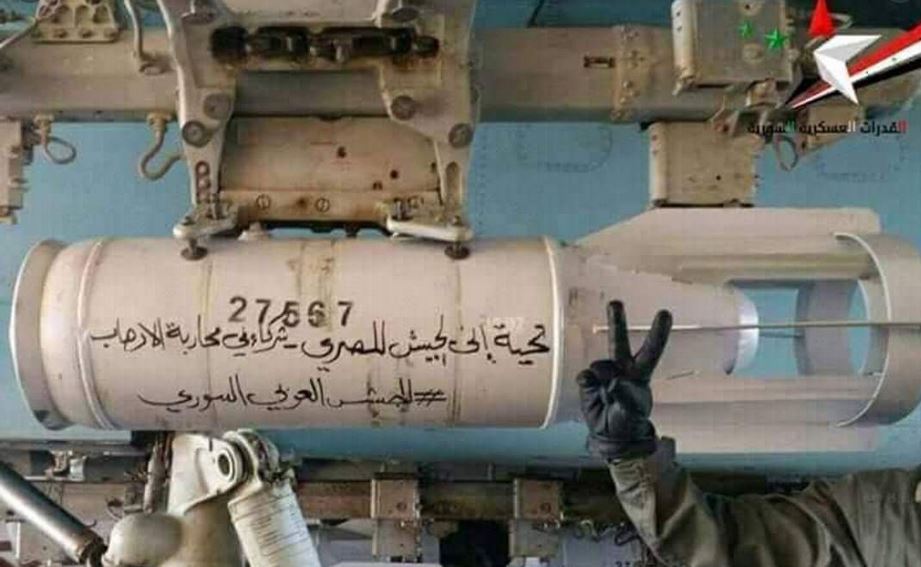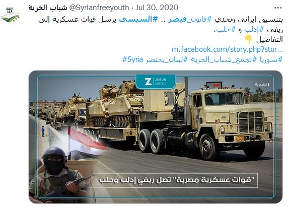 ومنذ وقت مبكر في 2014، رصد ثوار سوريا دعما عسكريا بالأسلحة والضباط من السيسي إلى جيش بشار في مواجهة ثوار سوريا، وهو ما تجدد أيضا في يوليو 2020، بعدما كشف ناشطون سوريون عن احتفاء جيش بشار بالأسلحة التي صدرها لهم السيسي وكتب قتيبة ياسين @k7ybnd99 عن بلاغ قدمه إلى الحكومة الأميركية وقال "السيسي يرسل للأسد ذخيرة من صنع معامل الشرق بمحافظة الشرقية، تدفع ثمنها الإمارات وتُنقل بطائرات شحن مصرية إلى مطار حماة على أساس أنها قطع غيار".