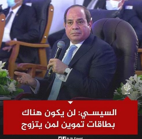 وقال قائد الانقلاب إنه "لن يتم عمل بطاقة تموين مرة أخرى لأكثر من فردين، موضحا أن ثقافة النمو السكاني وإنجاب عدد كبير من الأطفال دون دراسة من الأسر حول كيفية قدرتها على الإنفاق على الأبناء، لا بد أن تتراجع".