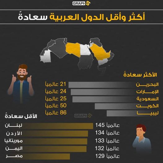 وصلت العراق في مؤشر السعادة 2022، والذي حددت الأمم المتحدة له 20 مارس من كل عام، إلى المرتبة 106 عالميا بينما كانت مصر في المركز الـ١٢٩ عالميا من أصل 146 دولة، بل وسبقتها أيضا ليبيا في المرتبة رقم 78، بحسب تقرير الأمم المتحدة لقياس جودة الحياة بين 2019 و2021 وتبعات جائحة كورونا.