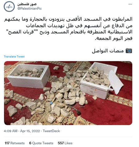 و"بادر عدد كبير من الشباب في #المسجد_الأقصى إلى وضع المتاريس والاستعداد لصد أي اقتحام لشرطة الاحتلال، انطلاقاً من توعد جماعات الهيكل بتقديم القربان اليوم الجمعة ١٤ رمضان والقمة الحاخامية في الأقصى مطلع رمضان، والخديعة التي انطوت عليها تصريحات نفتالي بينيت".